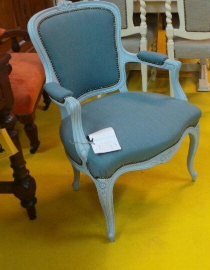 כורסה צרפתית מרופדת בבד תכלת צבוע בגוון תכלת